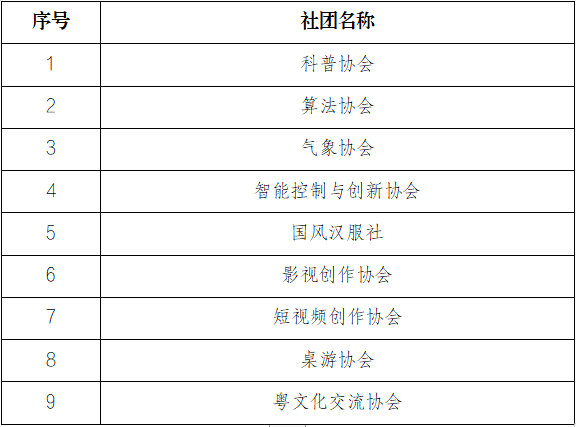 为了更好的繁荣校园文化,推动我校学生社团建设,切实将学生社团建设成为繁荣校园文化、服务学生成长成才的重要阵地,促进学生全面发展,经各学生社团申报,指导老师、挂靠单位和校团委审核,拟注册以下新社团为2022年度校级学生社团,现将社团名单公示如下: