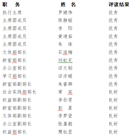 为深入推进学联学生会组织改革,规范学生组织工作制度化、规范化,全面加强对学生会工作人员的管理,提高工作人员服务同学的思想意识和履职能力,按照《关于推动高校学生会(研究生会)深化改革的若干意见》《加强和改进新时代学联学生会工作实施方案》等文件精神,我校开展了2022年校学生会中期述职评议工作。现将述职述评结果公示如下: