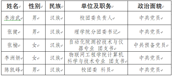 根据《关于筹备召开共青团无锡市第二十次代表大会以及代表名额分配和选举工作的通知》精神,各学院分团委在征求多数团支部和多数团员意见的基础上推荐提名,提出代表候选人初步人选考察名单,经征求代表候选人初步人选被考察人所在党组织和有关方面的意见,学校团的全委会讨论,确定李沛武、张健、张楠、李洲妍、陈凯峰等5名同志为出席共青团无锡市第二十次代表大会代表候选人初步人选,现予以公示如下: