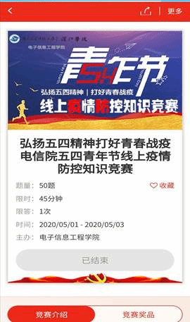 为纪念伟大的“五四”运动101周年,弘扬“五四”爱国、民主、进步、科学精神,营造良好的校园文化氛围,同时加强同学们对疫情防控知识的了解,提高学生的综合素质、促进学生健康成长,结合我院共青团和学生工作实际,电子信息工程学院在5月1日举办线上疫情防控知识竞赛。